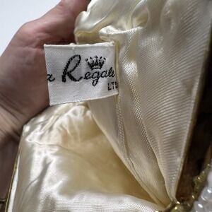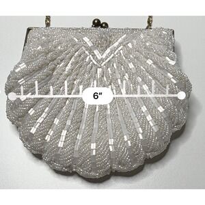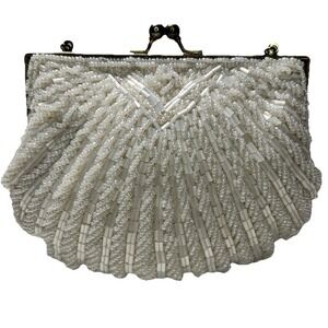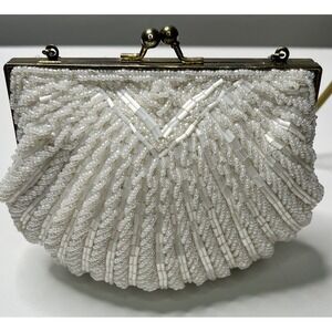 La Regale Gold Kiss-Lock Evening Bag Vtg White Beaded Clam Shell Clutch 80s Glam
