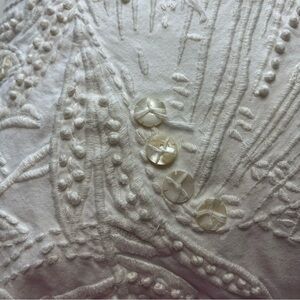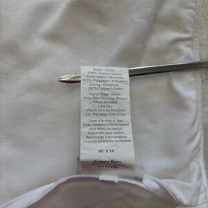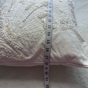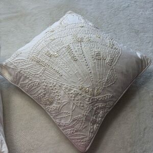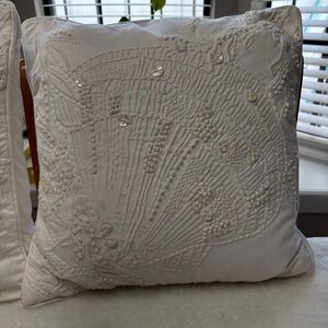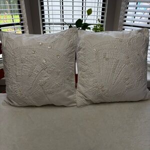 Elegant Pottery Barn embroidered shell pattern pillow covers with mother of pearl buttons, includes pillow inserts. 18”x18”