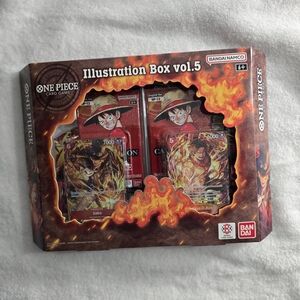 The One Piece Card Game: Illustration Box Volume 5 is a new, sealed collectible card game box featuring illustrations by 5ban Graphics and manufactured by Bandai. This box contains standard-sized cards from the "Carrying on his will" set, with a promo and booster feature. The box is in English and suitable for ages 6 and up, making it a great addition to any One Piece CCG collection. Get ready to dive into the world of One Piece with this exciting and detailed illustration box set.