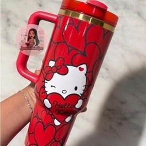 Charming Hello Kitty design with heart patterns. Durable and stylish for daily use. 40 oz tumbler with straw and straw topper.