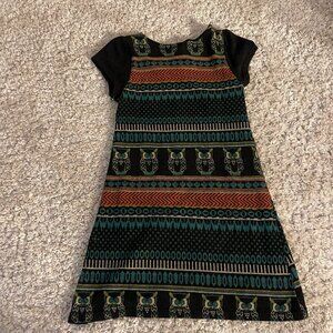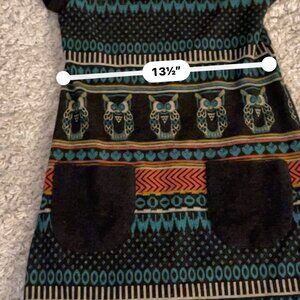 Super cute Gracia boho owl print knit dress in Size S with front pockets and sweet Peter Pan collar. Soft knit construction with vibrant teal/orange geometric & owl motifs. Casual whimsical vibe — layer with tights or boots for seasonal wear! Approx measurements shown.