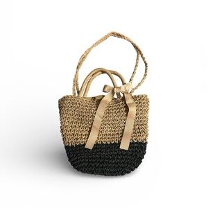 Stylish and versatile small two-tone straw tote bag. Perfect for any occasion with its elegant black and tan design.