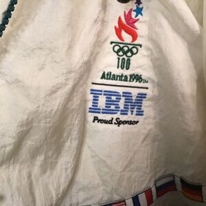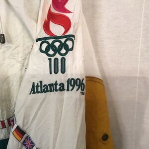 The jacket features embroidered logos, a half-zip pullover design, a hood, and a flag design of competing notions along the midsection. It was part of the official Olympic games. The jacket is considered a collectible vintage item from the 1996 Sz XL.