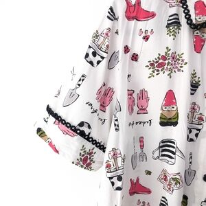 Charming Kate Spade button down shirt sleeve top with whimsical garden themed prints. Features a classic collar and short sleeves, with black ribbons.