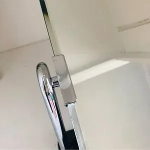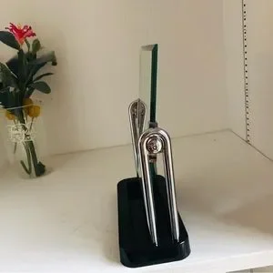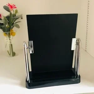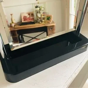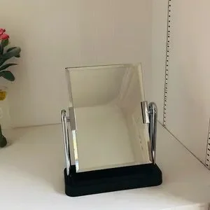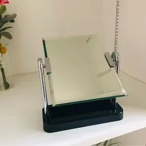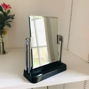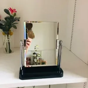 Stylish mirror with a shiny silver frame. Sturdy black base. Ideal for modern decor.