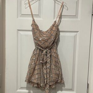 Stylish tan romper with silver sequin accents. Features a flattering draped neckline and adjustable straps. Perfect for a night out, never worn.