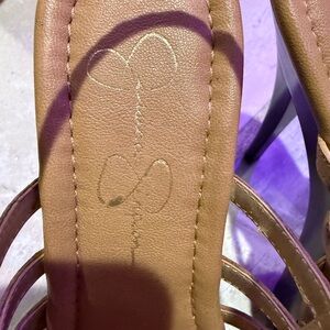 Elevate any outfit with these elegant Jessica Simpson platform heels in a classic nude/tan tone. Features a strappy caged design with a zip-back closure for easy wear and a sleek high heel that’s perfect for events, nights out, or special occasions.