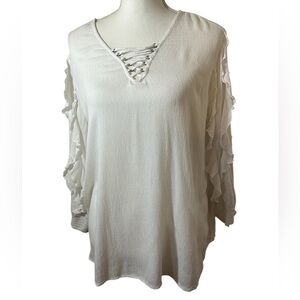 Democracy women's topfeaturing a lace-up V-neckline and ruffled sleeves. The style often falls into the casual, boho, or peasant blouse categories.