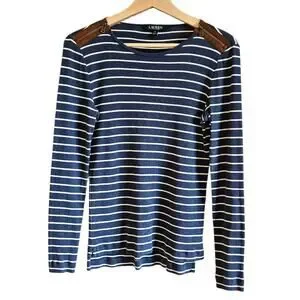Ralph Lauren striped long sleeve top in a classic navy and white colorway. Features faux-leather shoulder accents with decorative zippers for a polished, modern touch. Soft, comfortable knit with a flattering silhouette—perfect for work, everyday wear, or layering.