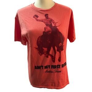 Urban Outfitters Ain’t My First Rodeo Graphic Slim Tee, Western Coral, Large. Giddy up in this tee featuring a bucking bronco cowboy graphic. Designed in a slim and cropped fit with a monochromatic graphic print calling out Austin, Texas. vintage washed and faded for a lived in look, crew neckline, 100% cotton. Excellent condition. #Western #Cowgirl #Rodeo #GinnyandGeorgia #AustinTexas