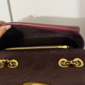 Stylish Coach shoulder bag in maroon leather. Features a gold chain strap and classic design. Ideal for versatile use.