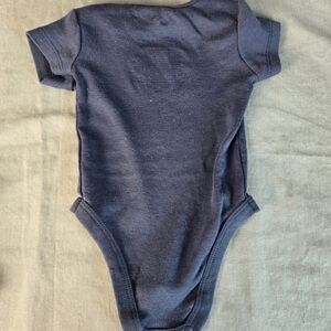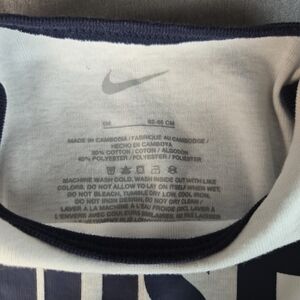 Set of 2 Nike baby onesies in size 6 months. Includes one navy bodysuit with white Nike Swoosh logo and one white bodysuit with “Just Do It.” graphic. Soft cotton fabric with snap closures for easy diaper changes.