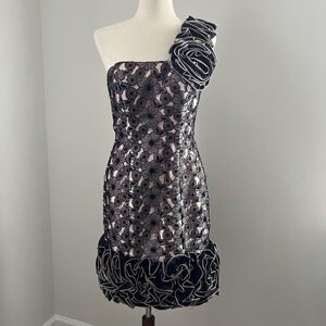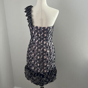 Sonia Peña One Shoulder Lace Cocktail Evening Dress Rosette Ruffle Hem Size 6