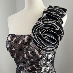 Design: One-shoulder silhouette with dramatic rosette ruffle at shoulder and matching ruffle hem. Fitted sheath style; fully lined; hidden back zipper. Embroidered floral lace overlay; structured statement ruffles; elegant formal look. Ideal for cocktail parties, weddings, formal events, or special occasions