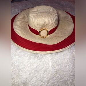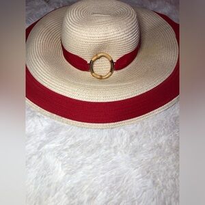 This stylish wide brim hat features a striking red band and a classic cream base, perfect for adding a touch of elegance to any outfit. Ideal for sunny days, this accessory combines fashion with function.