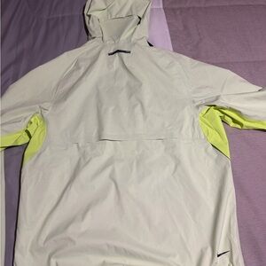 Lightweight performance jacket. Features a hood and full zip. Neon yellow accents on sleeves. The jacket uses the Storm-FIT ADV technology for wind and water resistance, ventilation, and trail running use.