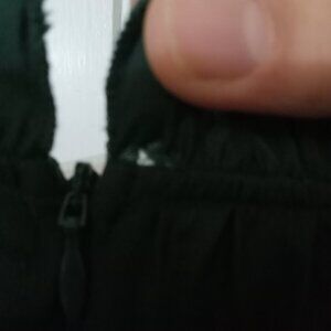 This is a beautiful dress! It has a back zipper and hidden side pockets. The skirt is fully lined. The material is a Polyester/Rayon blend with a subtle sheen. There is some pilling on the dress (see photos for examples) around the sleeves, hem, and waist area. It is not noticeable except up close. There is also a tiny pull in the neck ruffle next to the zipper.