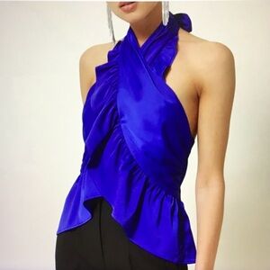 line and dot, line & dot tara top, satin halter top, open back halter, cobalt blue top, peplum top, ruffle blouse