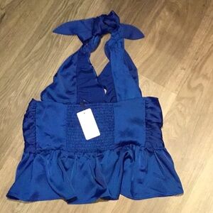Line & Dot Blue Satin Halter Ruffle Peplum Wrap Going Out Top S NWT