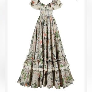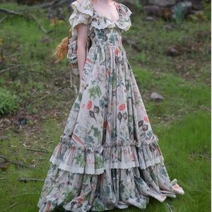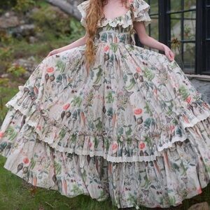 Not certain I want to part with this yet. This dress is a masterpiece! It needs an appreciative home where it’s worn and not just admired on a hanger. “Our cotton Swan Ritz Gown captures the beauty of foraging and cooking, showcasing our exuberant Garden Botanics print—a rainbow array of antique botanical illustrations that makes a beautiful statement for chefs and nature lovers alike. The structured corset-style bodice provides support with full underwire cups and elastic straps, complemented by ruffle sleeves and a pleated ruffle hem.”