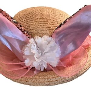 New without tags. Designed by me. One size fits most. It has pink wavy tulle with faux pearl accents around the brim and sequined bunny ears.