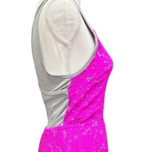 Has a fuchsia pink lace overlay with a gray jersey back and lining.