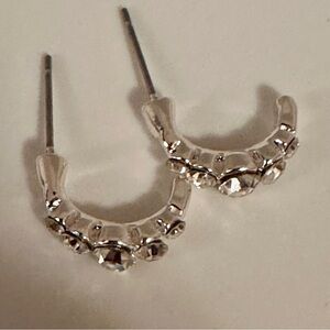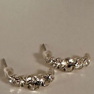 Elegant silver-tone semi hoop stud earrings featuring sparkling clear crystals in a curved climber style. These earrings give the look of a mini hoop with the comfort of a stud — perfect for everyday glam or special occasions.
