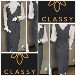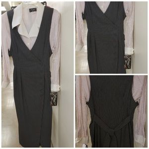 2 piece double breasted 7 front buttons, sleeveless, tieback dress w/t double collar button down front long sleeved striped shirt THIS DRESS WILL BE PERFECT FOR A BUSINESS MEETING VERY SEXY YET CLASSY