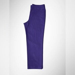 Pull-on slimming pants in a rich purple stretch fabric. Flattering straight leg, comfy waistband, and front pocket detail.