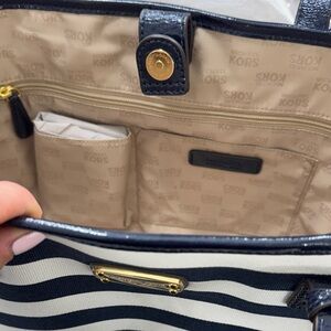 NWT Elegant tote with navy and white stripes. Features signature logo charm. Ideal for daily use.