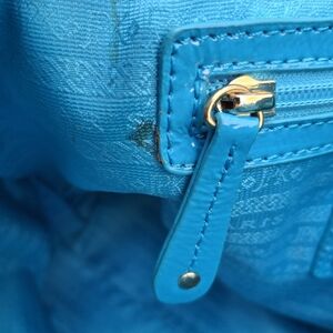 Stylish and vibrant blue patent leather tote bag perfect for any occasion. Features durable handles and a sleek design. Pre-owned and gently used JPK Paros 75 luxurious blue patent leather tote. Perfect for work or travel. Features one interior zip pocket, two interior slip pockets and magnetic snap closure. Measures 13.25×8×10.5 with a double handle drop of 10 inches. Interior has 2 spots as pictured. Exterior is in excellent condition with no callouts