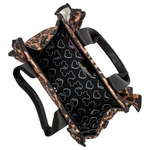 Chic tote with leopard pattern. Features black accents and heart detail. Includes bow and pearl charm.
