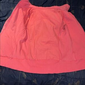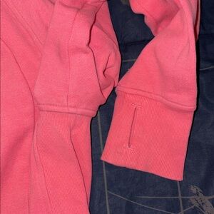 Cozy pinkish-orange hoodie with full zip. Features a comfortable hood and soft fabric.