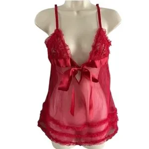Frederick's of Hollywood Babydoll Sheer Ruffle Lace Chemise Lingerie Red Large