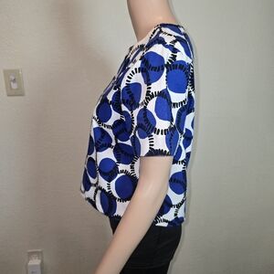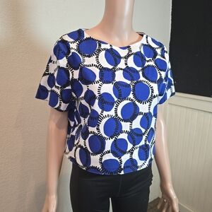 Kate Spade Blue Print Top White Cotton Mod Crop Blouse Short Sleeve Bold size Lg