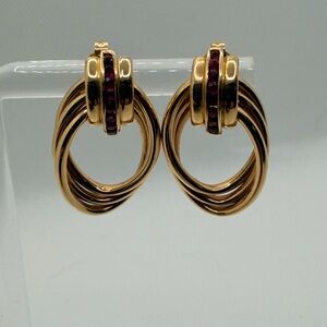 Elegant solid 14K yellow gold drop earrings featuring a sculptural multi-loop design with genuine ruby accents set at the top. Rich, deep red rubies add a refined pop of colour against warm gold. Substantial weight and beautiful movement — these feel luxurious on.