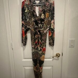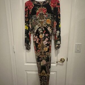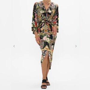 Designed in Australia, The Adorned In Alexandria Long Split Front Twist Dress unveils an architectural haven where lush florals entwine with majestic archways beneath a tranquil sky. Lovingly handcrafted, this CAMILLA jersey midi dress features a relaxed fit throughout the body with a twist drape detail upon the waist. The skirt skims the curves and tapers into a midi length slightly high low hemline with a curved front split for effortless elegance.