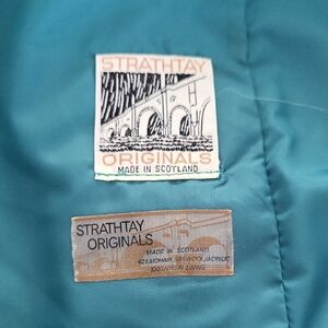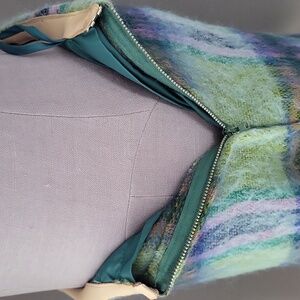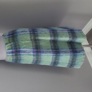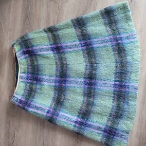 Cozy up in classic vintage style with this beautiful Strathtay mohair and wool blend skirt. Made in Scotland, this A-line skirt features a soft brushed mohair texture with a striking green, purple, and blue plaid pattern. The high-quality wool blend gives it warmth, while the mohair adds that fuzzy, luxe finish that's perfect for fall and winter styling. Side zip with clasp, fully lined with faced waistband. Waist- 14 in laying flat Length - 26 in Hips - 22 in laying flat