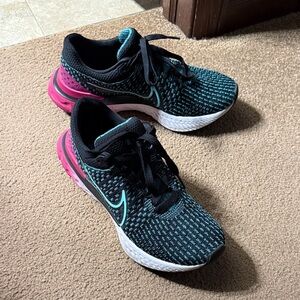 Nike React sneakers featuring a black and teal design. Pink accents add a vibrant touch. Ideal for sports and casual wear. Women’s size 8. Only worn a handful of times until my feet grew after pregnancy and now they are too tight for me.