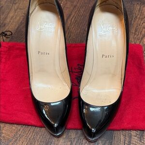 Beautiful CL Rolandos. Rolandos are great for wearing yet also elegant due to the concealed platform. Get that extra height without sacrificing comfort! Patent leather is in almost pristine condition. Redone vibram soles and new heel tips. Very few blemishes on these shoes but for around the heel tips (see pictures). Comes with dust bag.