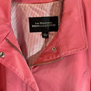 Elegant La Nouvelle Renaissance pleather jacket in a vibrant pink hue. Features practical front pockets and a sleek design. Perfect for versatile styling.