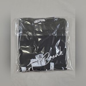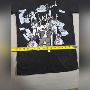 Black t-shirt featuring a Heart Break Hotel graphic with cartoon character and money bags.