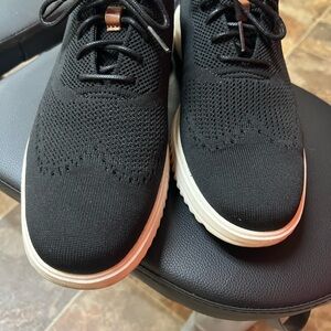Sleek black knit dress sneakers with stylish brown details. Perfect for casual wear.
