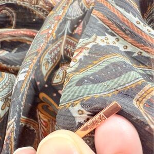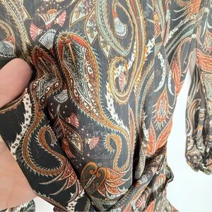 The Pamela Wrap Dress by MISA Los Angeles is made of chiffon with a warm paisley pattern. Think: boho luxe, western-inspired, fall-core, effortless cool.
