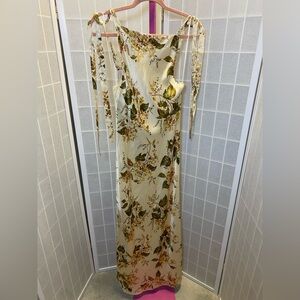 Chic maxi dress with floral design. Cream base with elegant floral patterns. Ideal for special occasions.