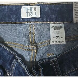 The Time And Tru Women's 12 Short Jeans are designed for petites, featuring a skinny style in a classic blue color. Made from a blend of polyester, spandex, and cotton, these jeans have a zip and button closure for a secure fit. With a size 12S, these jeans offer a comfortable and stylish option for women looking for a fashionable and trendy addition to their wardrobe.
