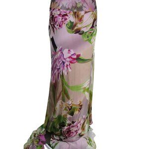This enchanting fairy-like maxi dress features an asymmetrical halter design, sequin mesh bodice, flowing ruffled accents and floral patterns, perfect for prom or any special occasion. In a delicate pink hue, it embodies a princess-like charm with its long train. Size IT 42 which is a US 6.