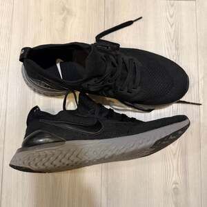 Nike Epic React Flyknit 2 Running Shoes in Black/Anthracite, Men's size 8.5. These sneakers feature a lightweight and breathable Flyknit upper paired with responsive React foam cushioning for a smooth ride.