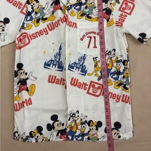 One chest pocket with "Walt Disney World 71" embroidered on it. Print features vintage style Fab 5 - Mickey, Minnie, Goofy, Donald, Pluto. Vibrant, vintage style Disney World graphics. Features classic characters. Perfect for casual wear. Approximate measurements shown in photos.