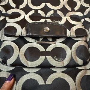 Classic Coach signature jacquard shoulder bag in black and silver/gray with black leather trim and silver-tone hardware. Features a roomy interior, zip-top closure, and comfortable shoulder strap—great everyday bag with that timeless Coach look.
